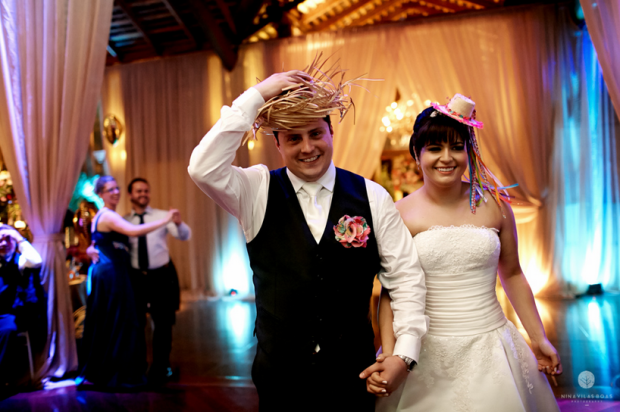 Os noivos e convidados se divertiram muito, inclusive com o kit junino entregue, em determinado momento estava tão animado que teve até quadrilha!